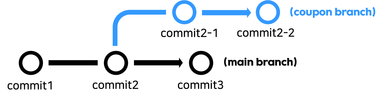 Head가 commit2를 가리키고 있다면 현재 위치는 commit2를 의미하고 현재 위치에서 coupon이라는 이름을 가진 branch를 생성하기 위해 아래 명령어를 실행해줍니다.