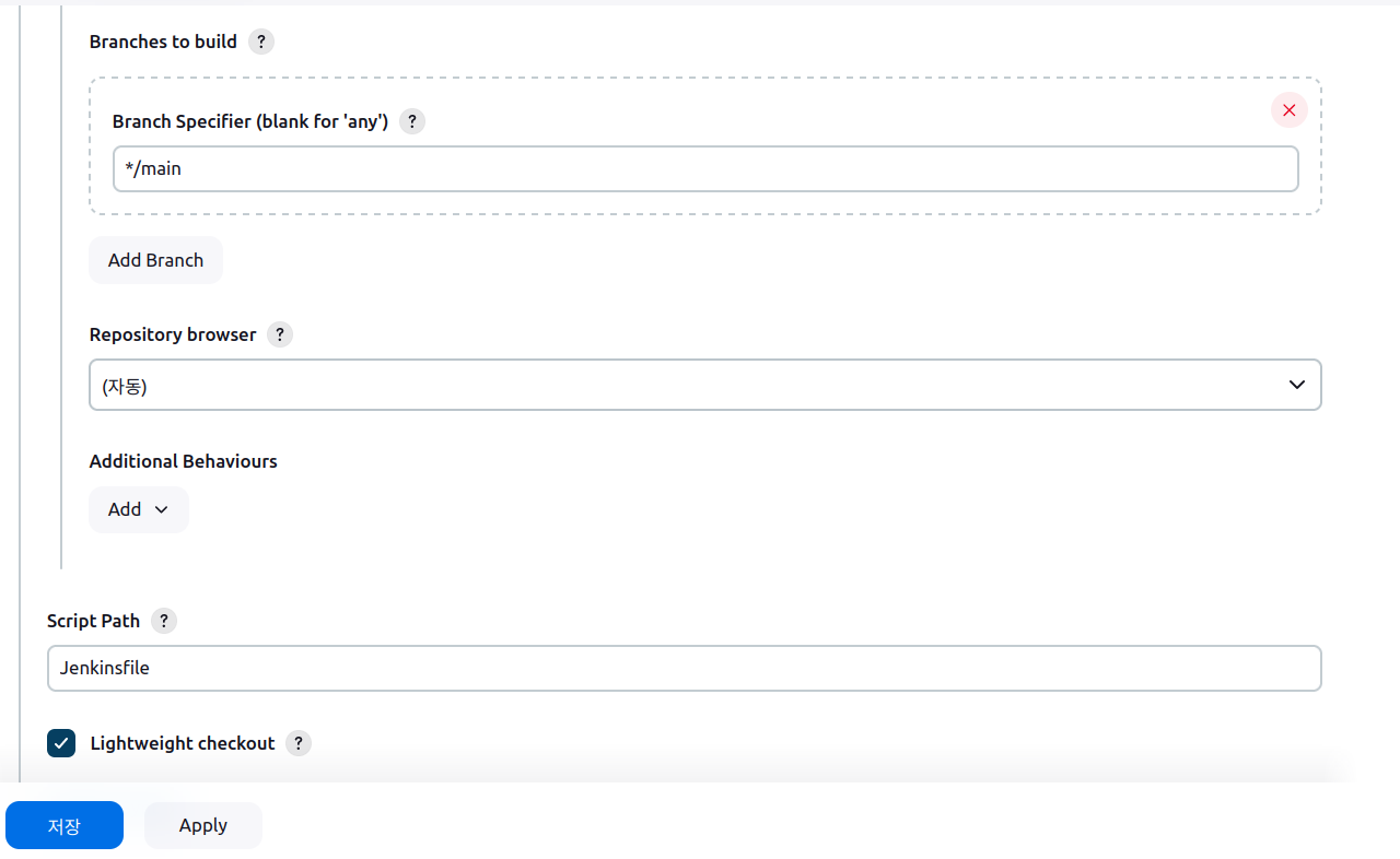 정확한 Jenkinsfile 위치를 입력합니다. 저 같은 경우 프로젝트의 루트디렉토리에 위치하기 때문에 Jenkinsfile만 입력하였습니다.